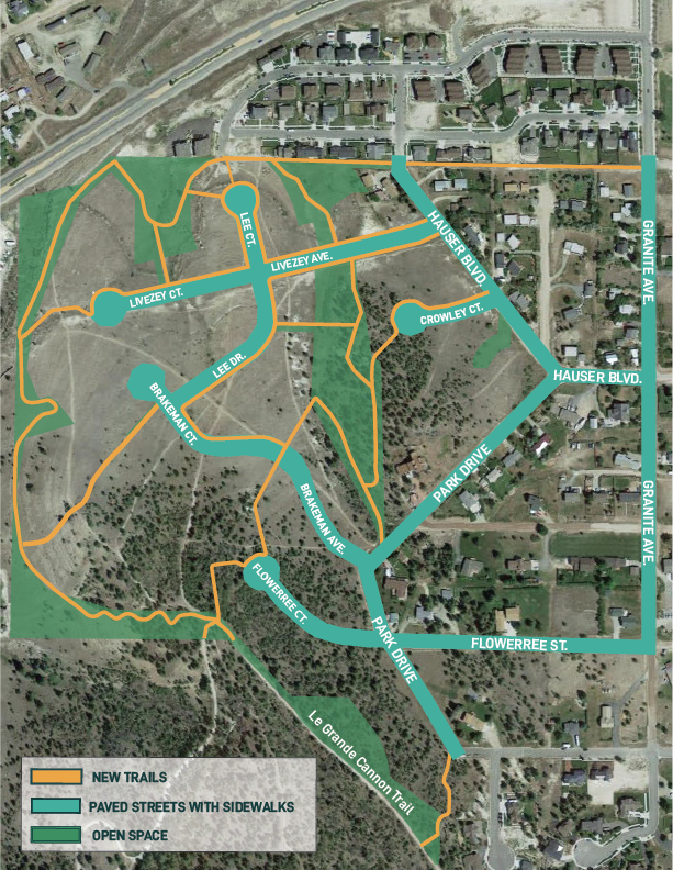 All proposed trails will be open to the public for public access. Pedestrians and bicyclists will be able to utilize the proposed sidewalks and streets to access existing open space to the south of the subdivision and connect to the Mount Helena trail system.